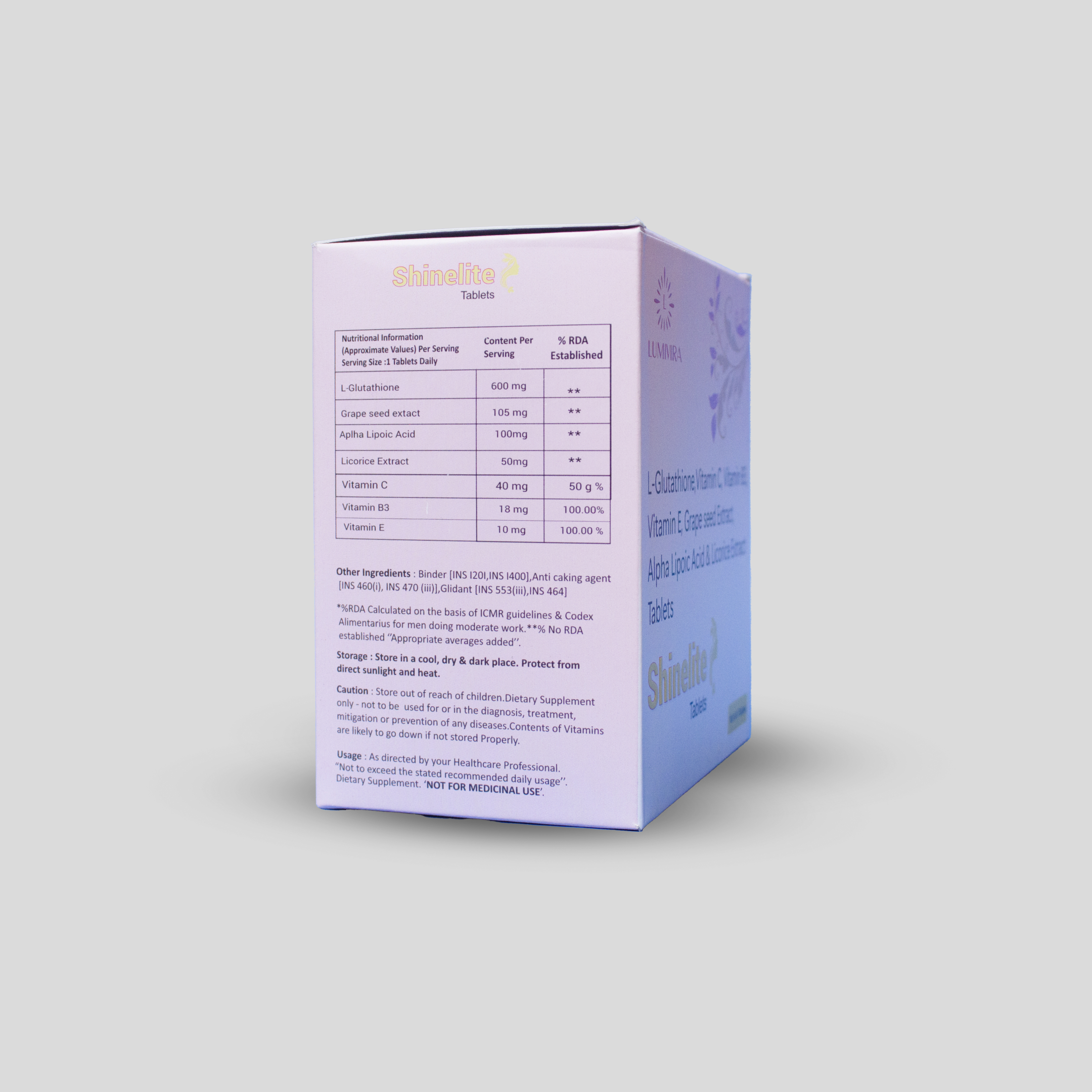 Shinelite Tablet – L-Glutathione, Grape Seed Extract, Alpha Lipoic Acid, Licorice Extract, Vitamin C & Vitamin E Tablets