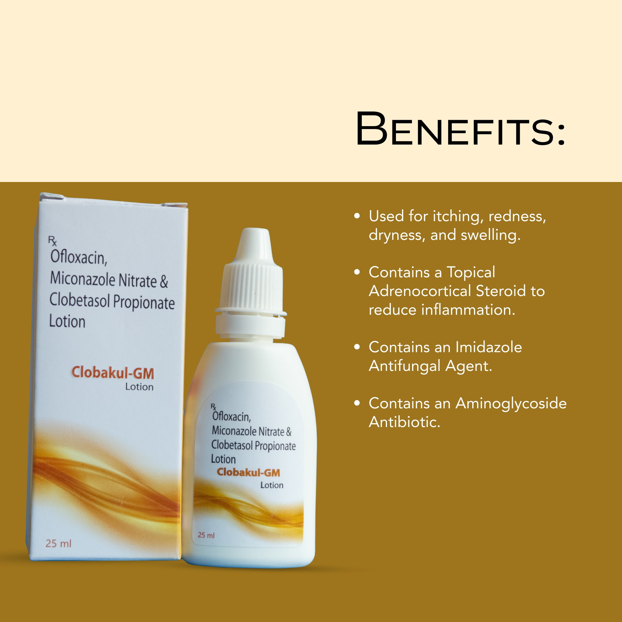 Clobakul-GM Lotion is a broad-spectrum dermatological formulation that provides effective relief from inflammation, itching, and infections of the skin. Enriched with Clobetasol Propionate, Gentamicin Sulphate, Miconazole Nitrate, and Zinc Oxide, it works against bacterial and fungal infections while soothing irritated skin and promoting healing.