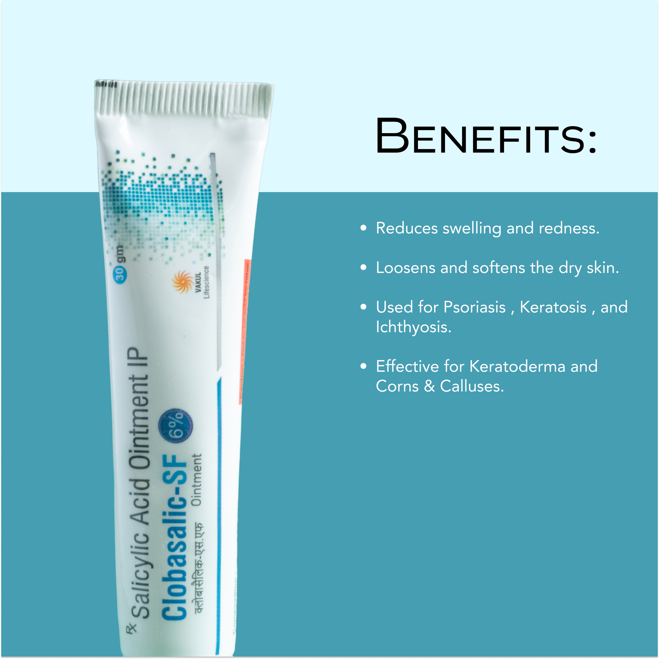 Clobasalic-SF 6% Cream contains Salicylic Acid IP 6% w/w, a keratolytic agent used to treat psoriasis, warts, calluses, corns, and other scaling skin conditions. It works by softening and removing dead skin cells, allowing healthier skin to regenerate.