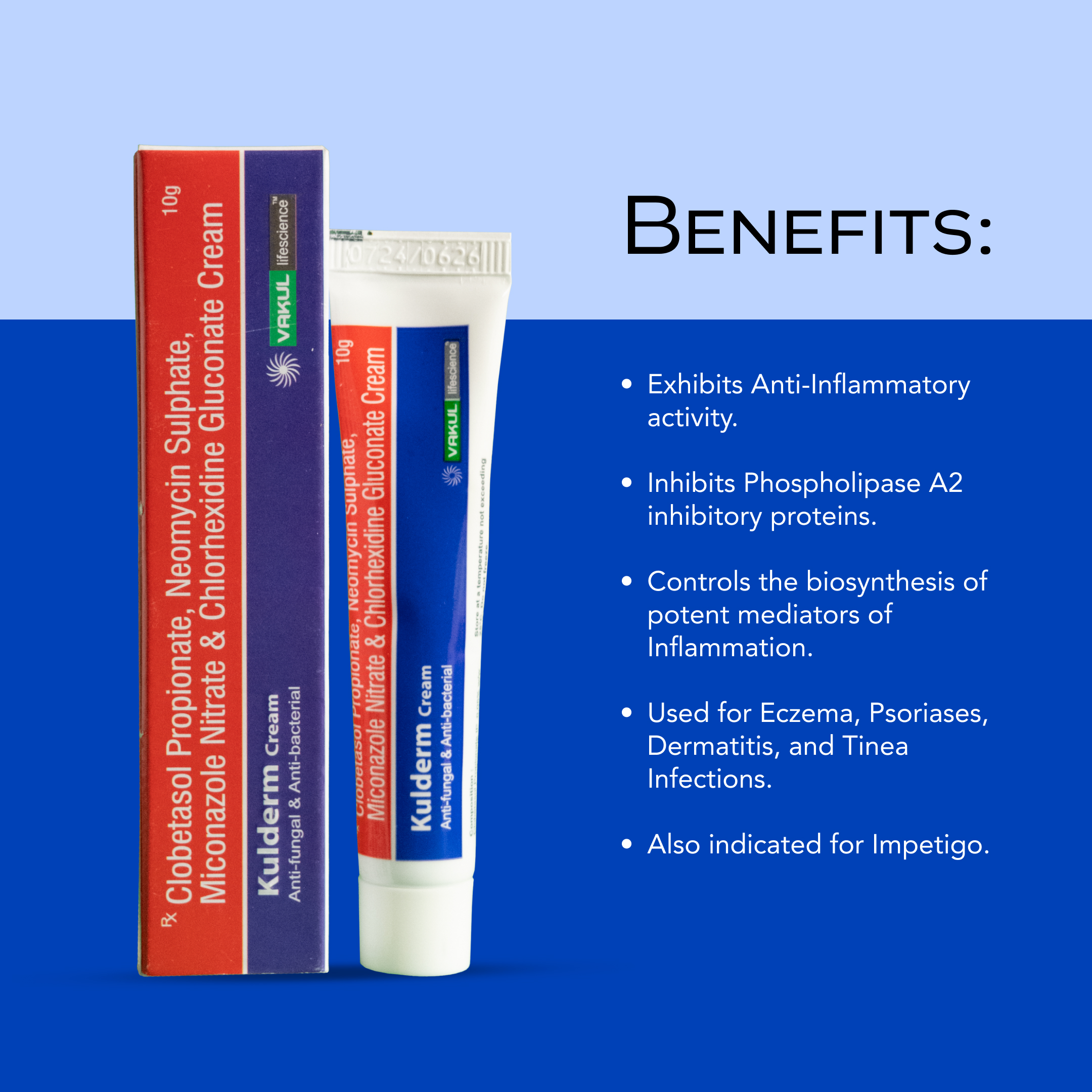 KULDERM Cream is a comprehensive topical formulation that combines Clotrimazole, Neomycin, Beclomethasone, and Chlorhexidine to effectively treat a wide range of fungal, bacterial, and inflammatory skin infections.
