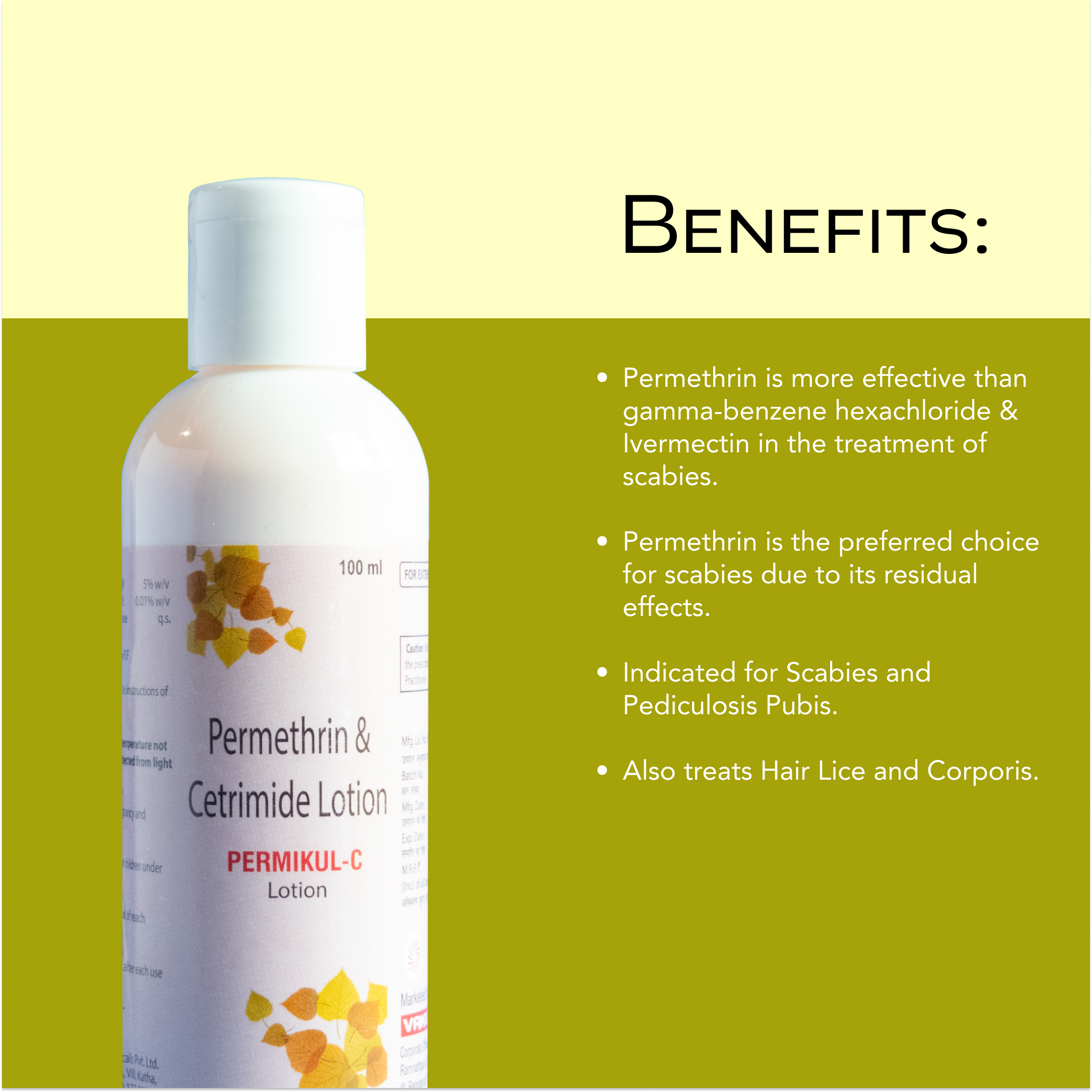 PERMIKUL-C Lotion is a topical scabicidal and pediculicidal formulation that combines Permethrin 5% with Cetrimide. It is used for the treatment of scabies (itch mite infestation) and pediculosis (lice infestation). The formulation effectively kills mites and their eggs while providing antiseptic and cleansing action to prevent secondary infections.