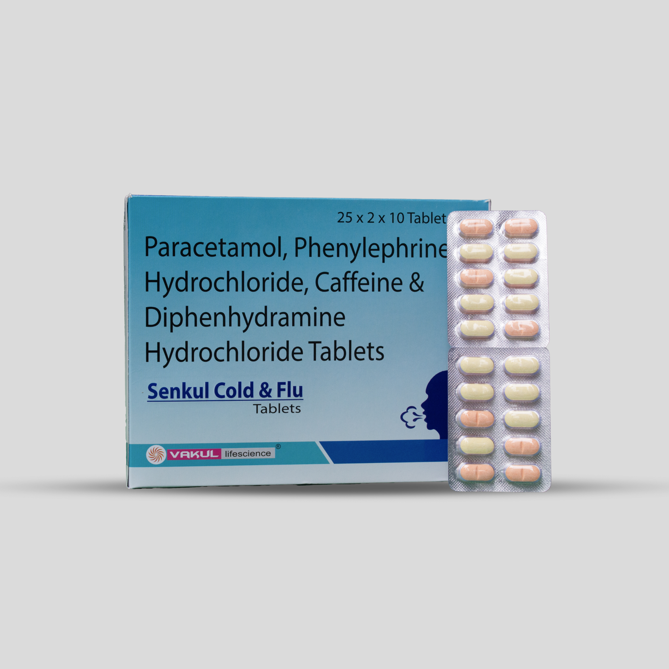 Senkul Cold & Flu Tablet is a multi-symptom relief formulation that effectively reduces fever, body pain, nasal congestion, headache, and other discomforts associated with cold and flu. The combination of Paracetamol, Phenylephrine Hydrochloride, Caffeine, and Diphenhydramine Hydrochloride provides complete symptomatic relief while promoting quick recovery.