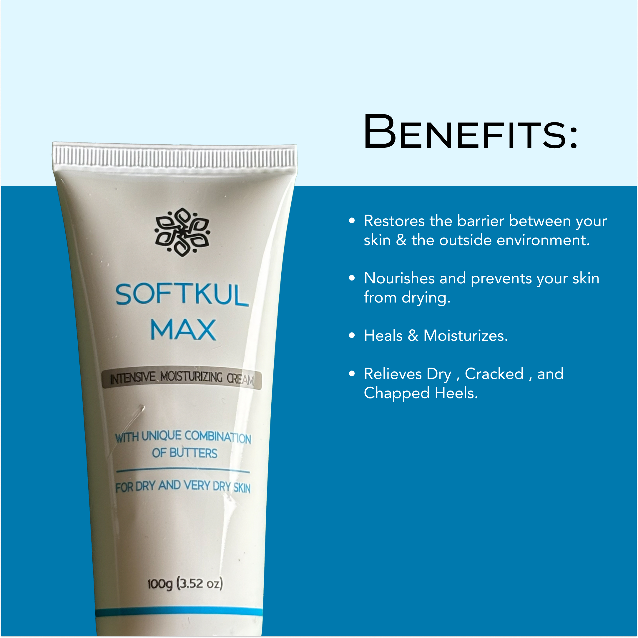 SOFTKUL MAX Moisturising Cream is a rich, nourishing formula that deeply hydrates and restores the skin’s natural softness. Infused with Shea Butter, Mango Butter, Cocoa Butter, and Aloe Butter, it provides long-lasting moisture, while Zinc Oxide and Dimethicone help protect and smooth the skin barrier.