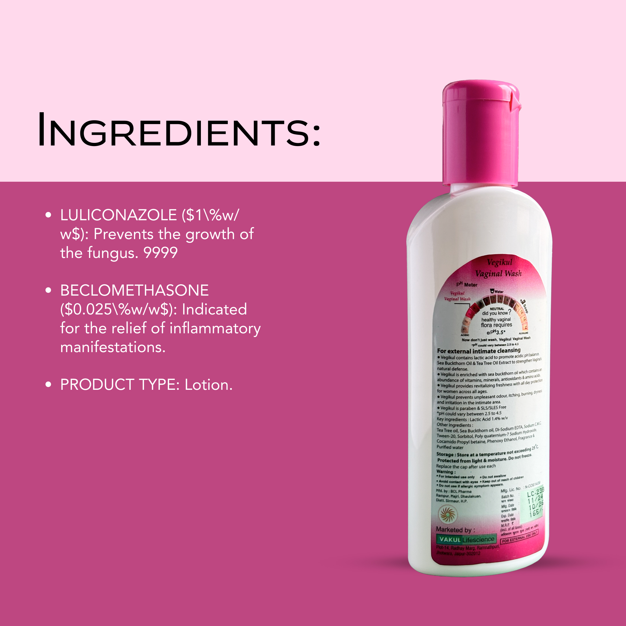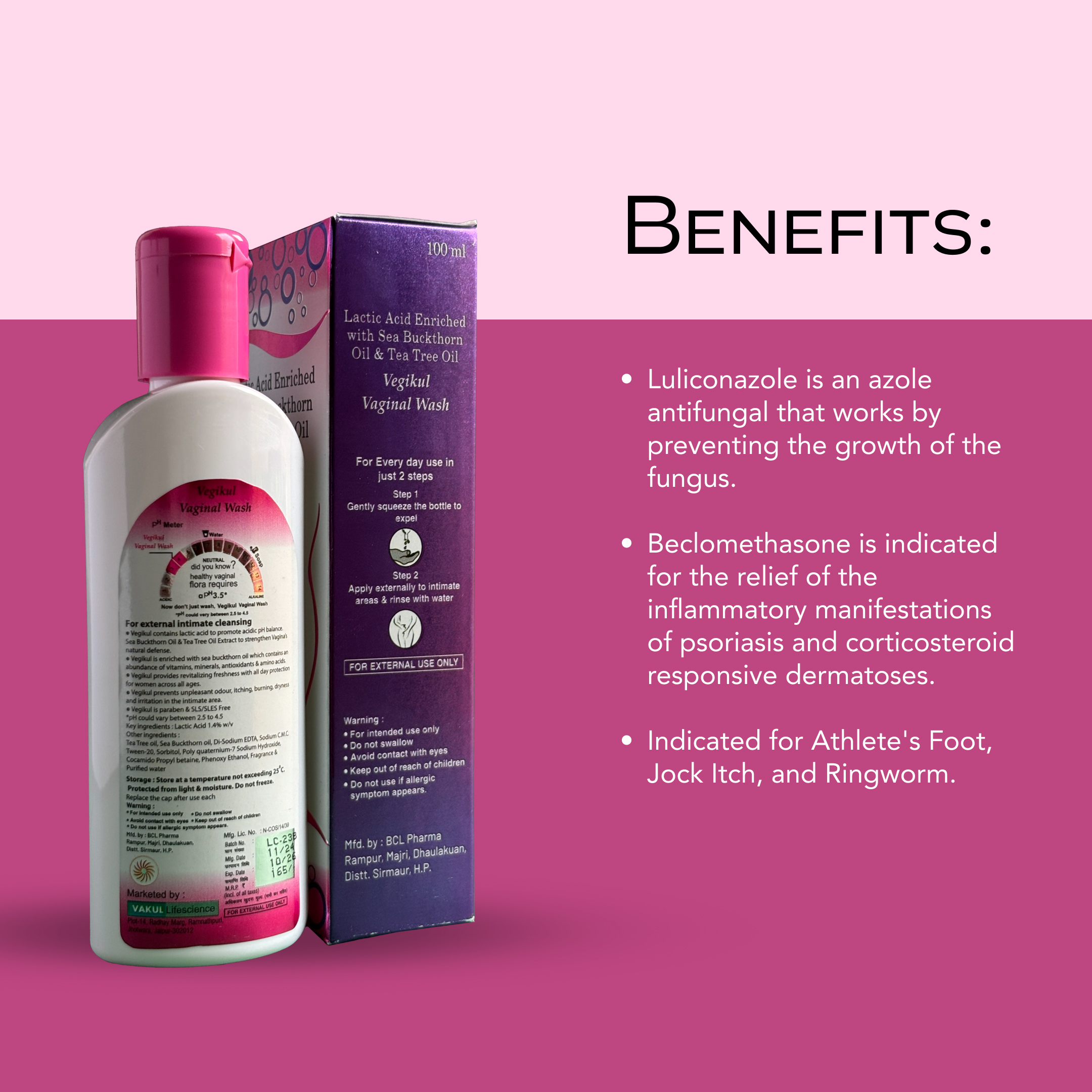 Vegikul Vaginal Wash is a gentle, pH-balanced feminine hygiene wash enriched with Lactic Acid, Sea Buckthorn Oil, and Tea Tree Oil. This unique formulation helps maintain natural vaginal flora, prevent irritation, and keep you feeling fresh and confident all day.